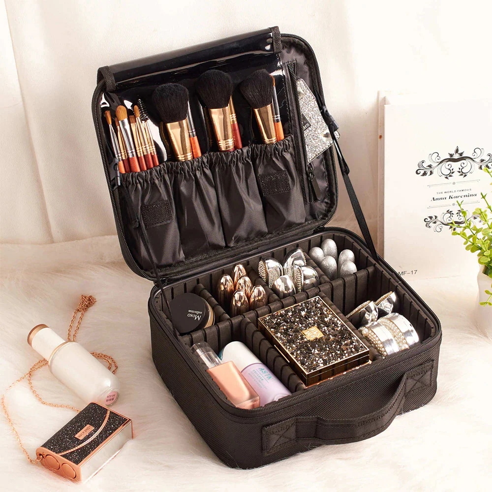 メイクブラシの収納が多いのがいいです‼汚れも付かないようにカバーがあるのも◎180℃がっつり開くようにも出来るし、中にベルトがあるのでそれを使えば90℃でも使えるし、使い勝手はよさそう。私はあまりメイク用品持ってないからスペース余ったけど、いっぱいある人なら大きいサイズのほうがいいかも。高さはキャンメイクのアイベースくらいの高さだから、ちょっと長さのあるリップとかは寝かせて収納する感じです。