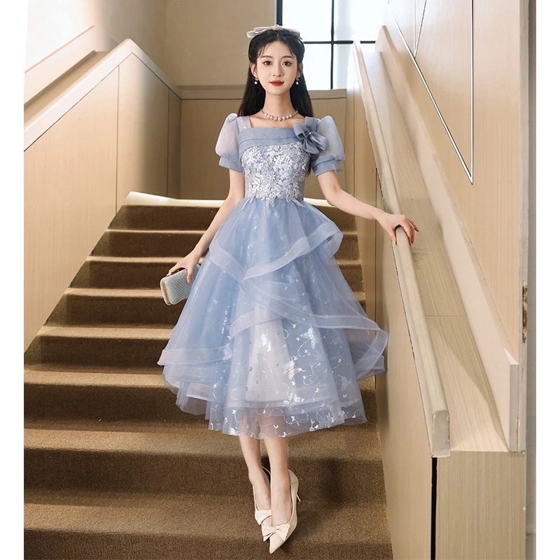 ブルーリトルイブニングドレス2025宴会ハイエンド気質ホストパフスカート女性