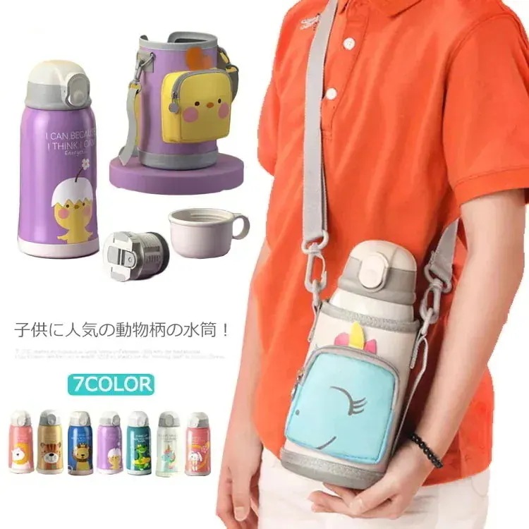 ステンレス 水筒 キッズ ワンタッチ 子供 魔法瓶 直飲み ダイレクトボトル 550ML 保冷 スポーツボトル ストロータイプ ポーチ付 動物柄 女の子 男の子 ステンレスボトル