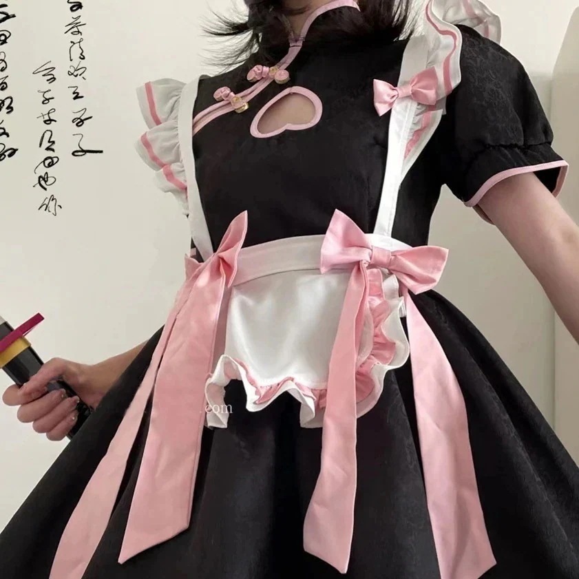 中国風ピーチロリータボタン中空ドレス ロリータ半袖ホルタードレス