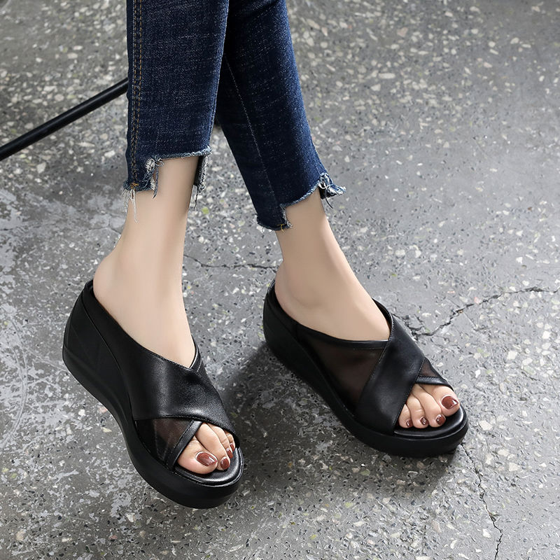 厚底サンダル年新型本革メッシュスリッパ夏の外はおしゃれな厚底坂と涼しいスリッパマドレーヌで女性靴を高くする