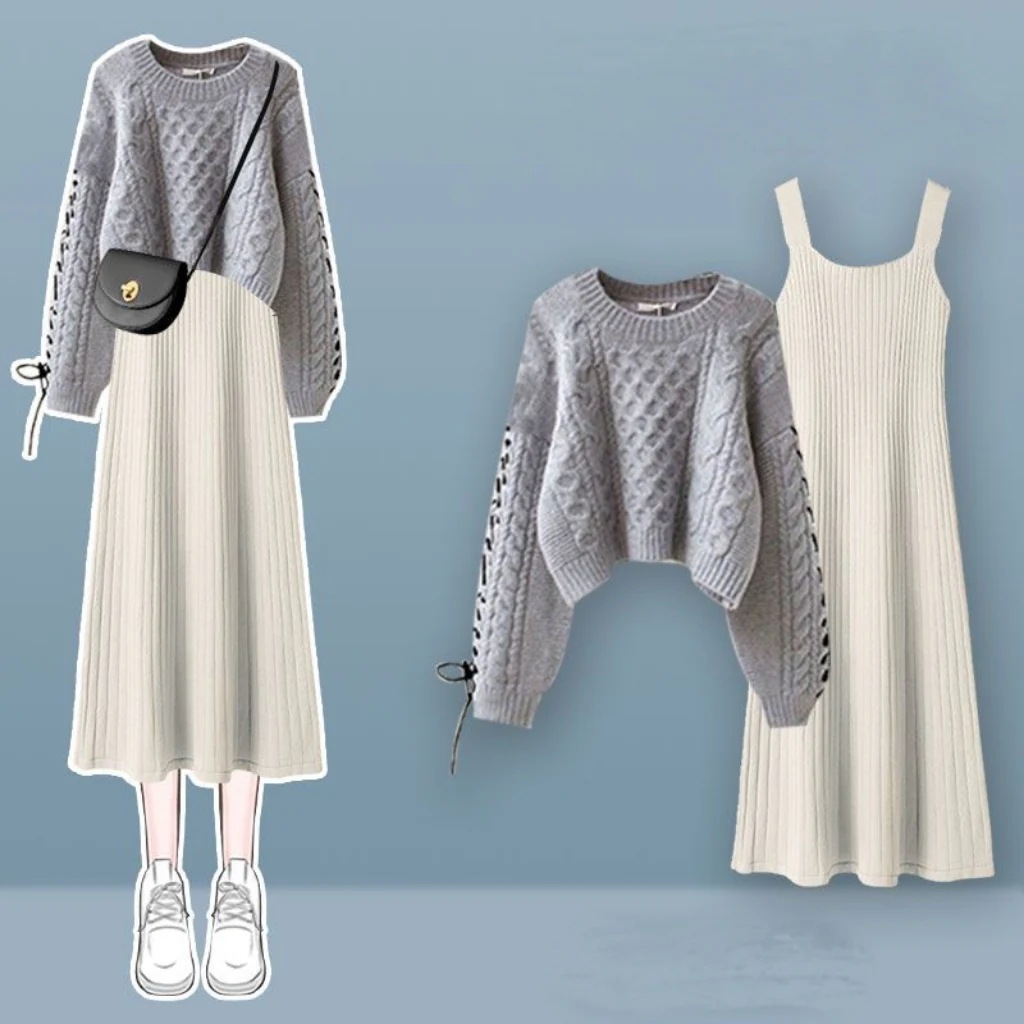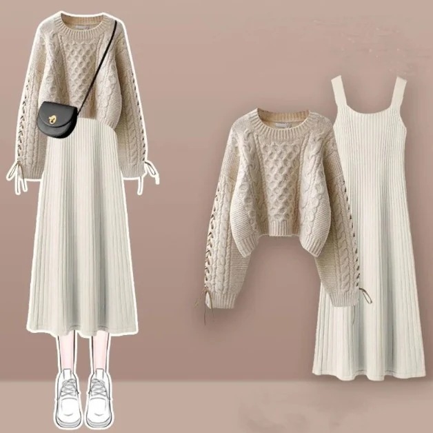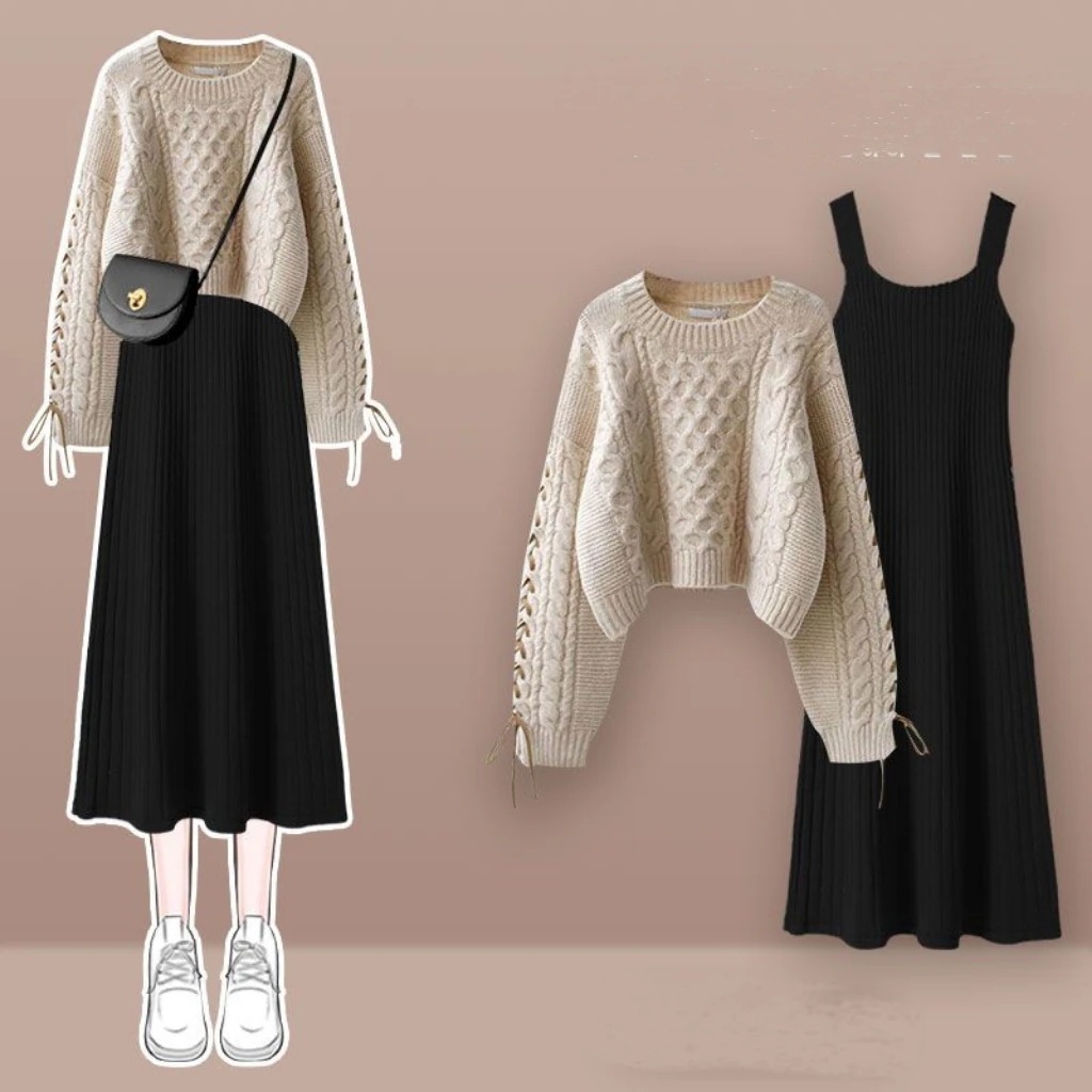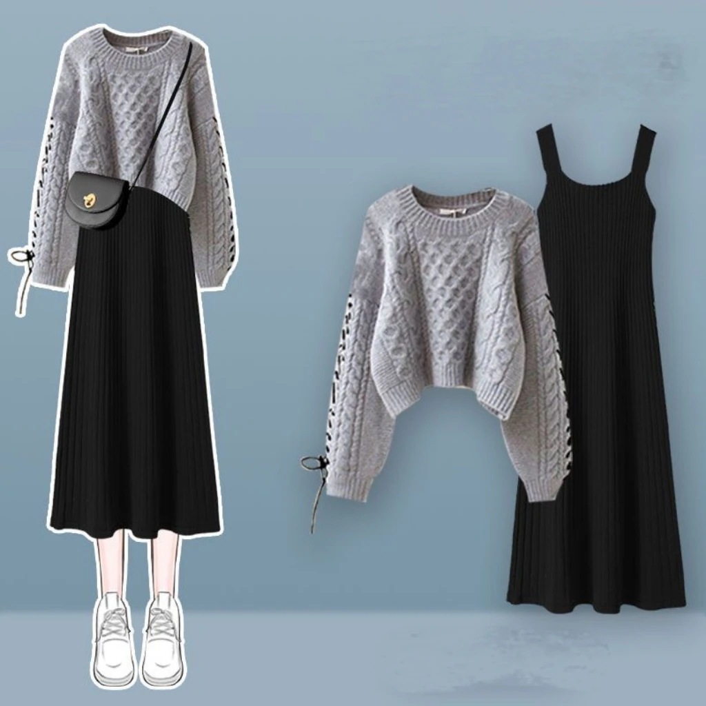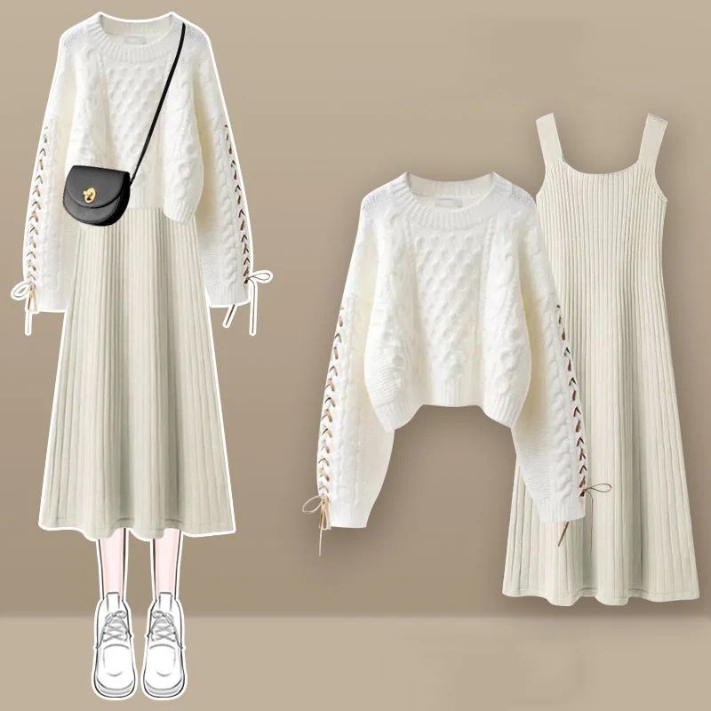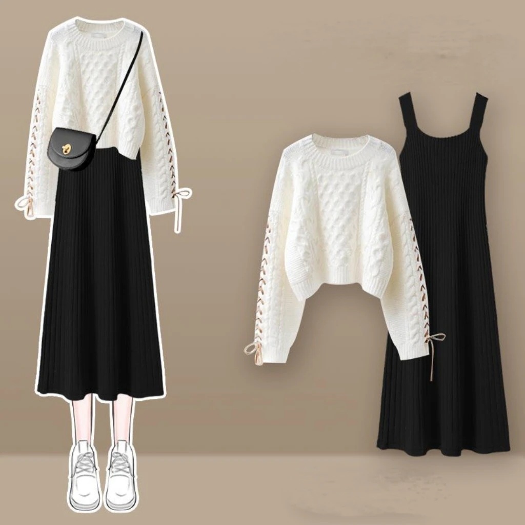 【大好評】 無地長袖シンプルファッションレトロボウタイラウンドネック+ハイウエストAラインワンピースセット