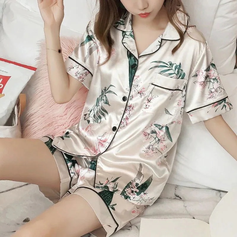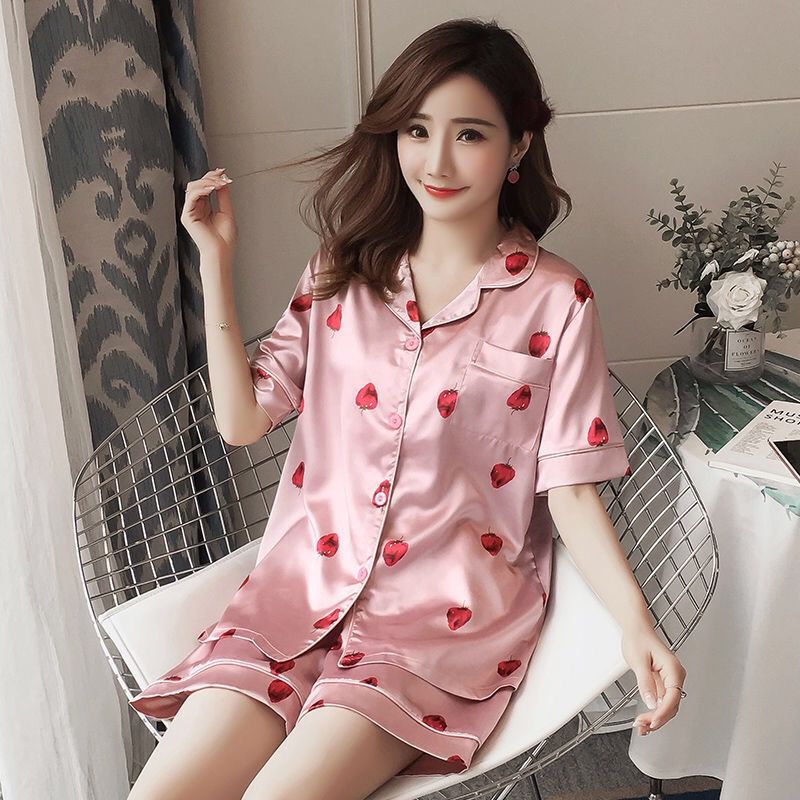 パジャマ ルームウェア夏のアイスシルク半袖2点セット本物のシルク学生の薄手のスーツを着て部屋着を着ることができます レディース 韓国ファッション