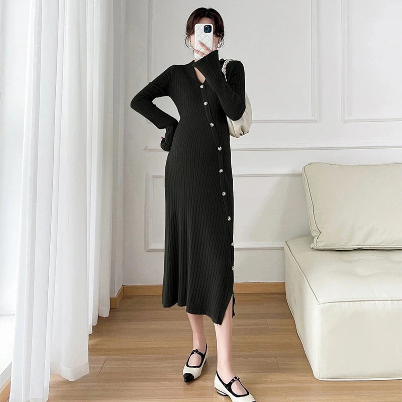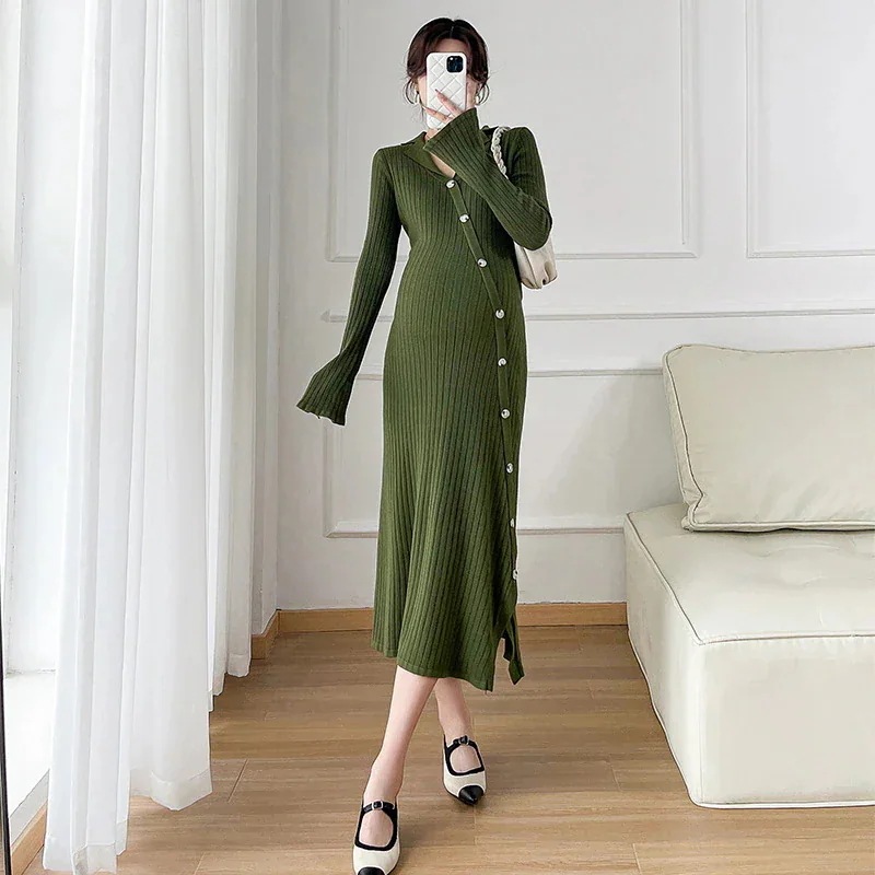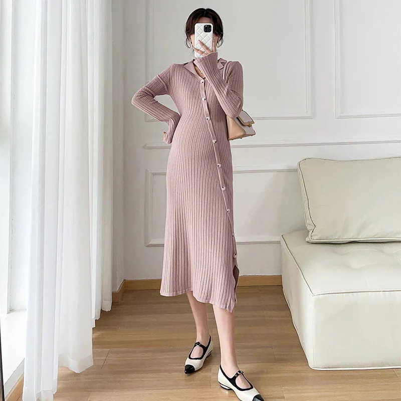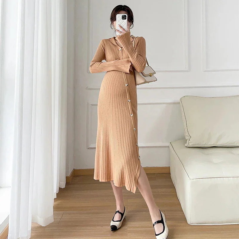 韓国 マタニテ 秋冬 可愛い 通勤 大人 上品 妊婦 おしゃれ 裏起毛パンツ マタニティウェア ニットワンピース 高級感 斜め前たて