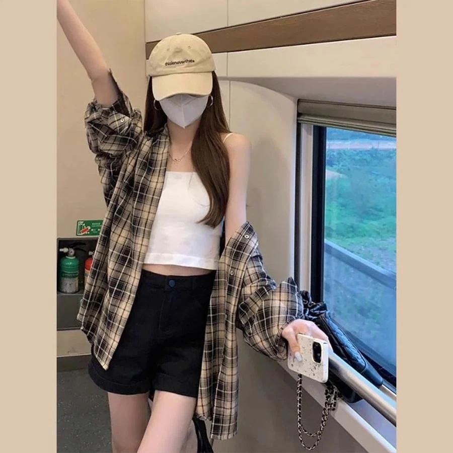 ブラウス 韓国ファッション 長袖日焼け止めチェックシャツ夏の薄手2024新デザイン感トップスゆったりカジュアルコート春秋 長袖ブラウス