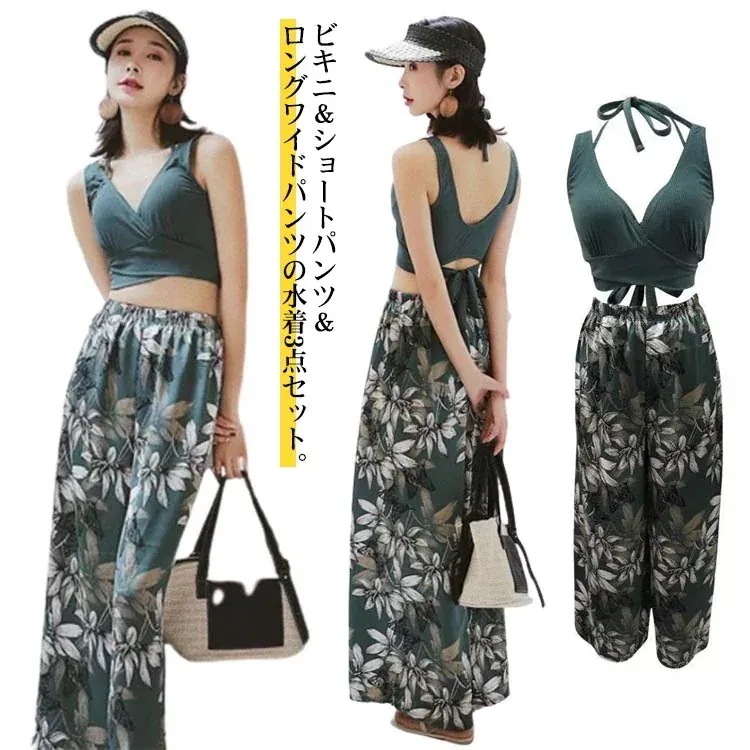 お尻 ビキニ ショートパンツ 40代 3点セット 水着 タンキニ バスト ワイドパンツ 体型カバー レディース ロングパンツ 大人 太もも カバーアップ 女性 露出控えめ ビーチ 盛れる 代 30