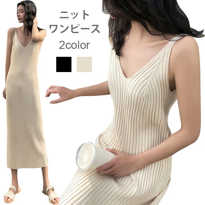ワンピースレディースニットワンピースキャミソールワンピースロングワンピースミモレワンピースノースリーブキャミワンピVネックリブニットリブ編み無地ストレッチお洒落シンプルカジュアルインナー春作