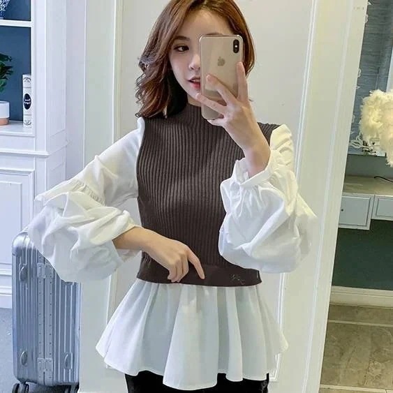 トップスブラウスシャツレディースリブニットベスト重ね着レイヤードハイネック長袖バルーンスリーブフリルペプラムロング丈きれいめおしゃれかわいいSMLXL黒ブラック灰色グレー茶色ブラウン春秋