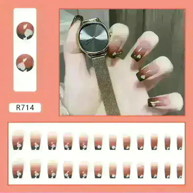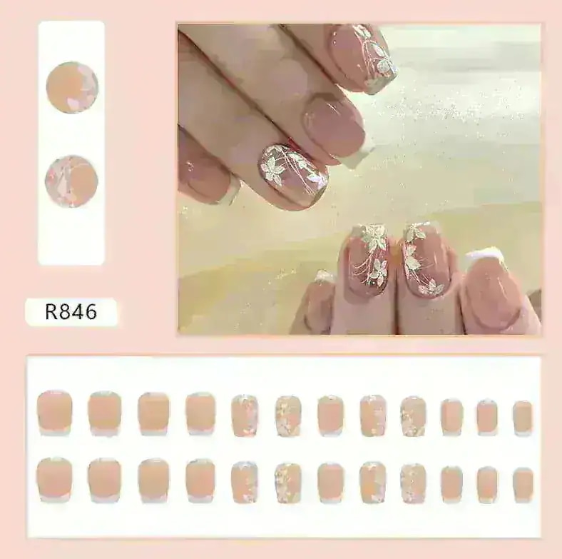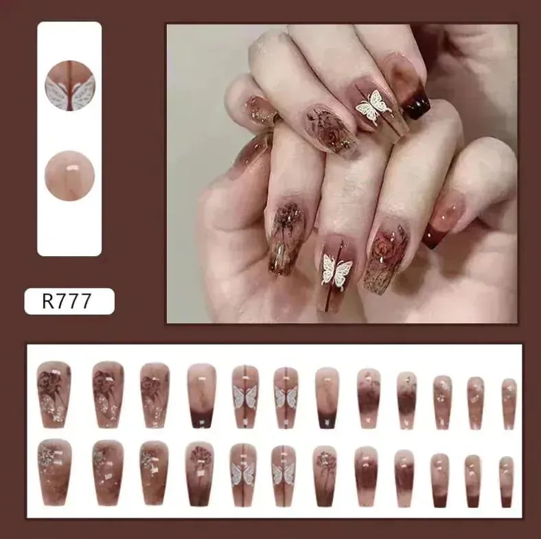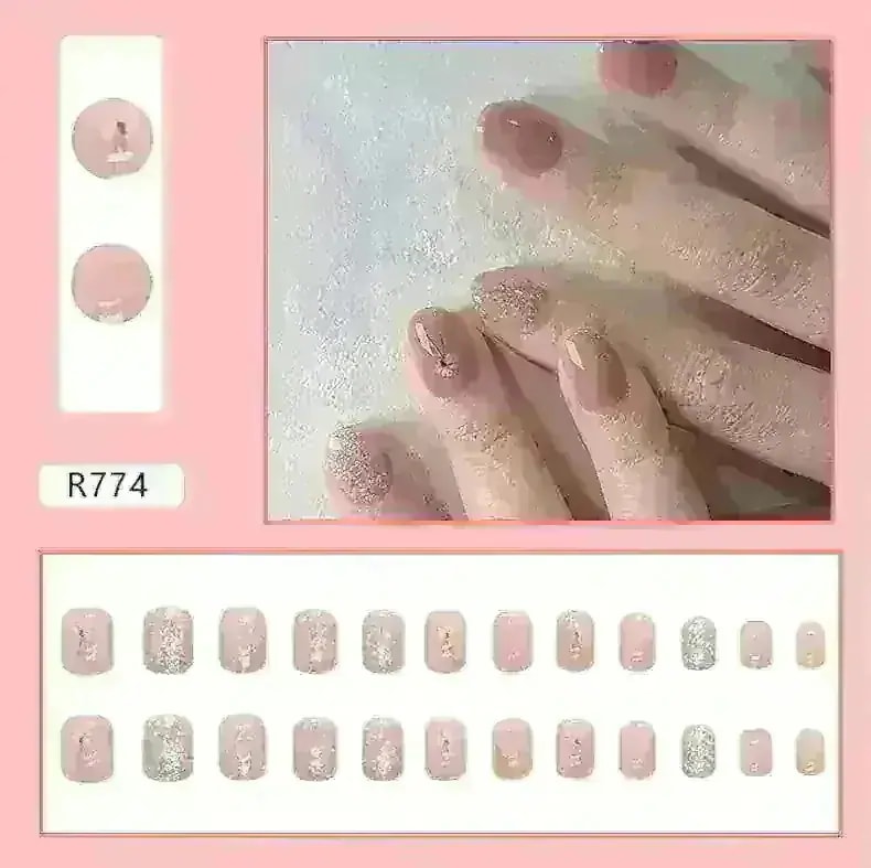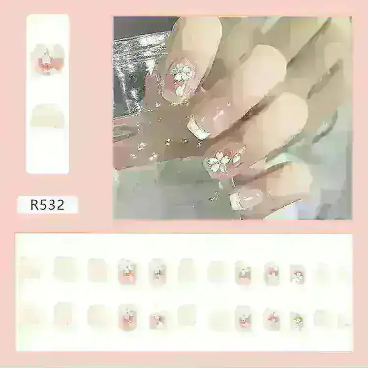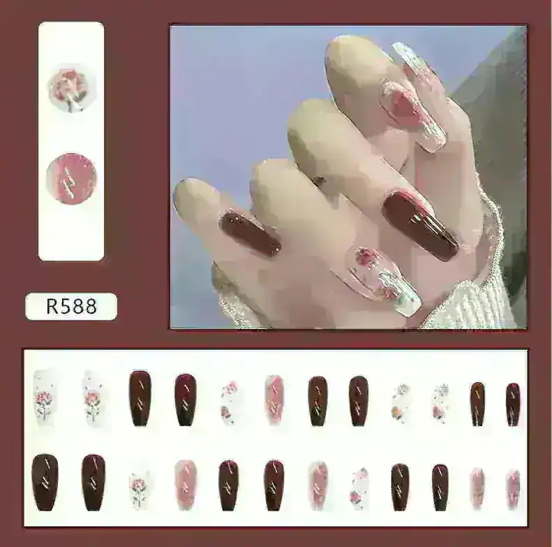 R774:サンプル写真を見ると、お花の部分が濃い茶色のように見えましたが黒色でした。また、思っていたよりもピンク見が強い商品です。ネイルの形はカーブが強く、縦に長めのネイルチップとなっています。
