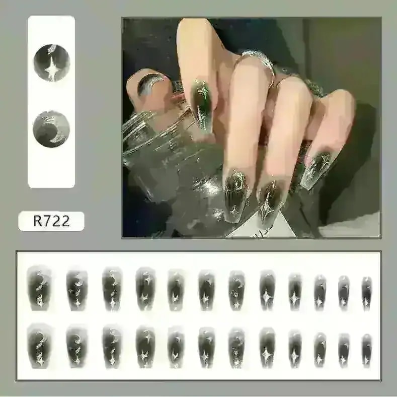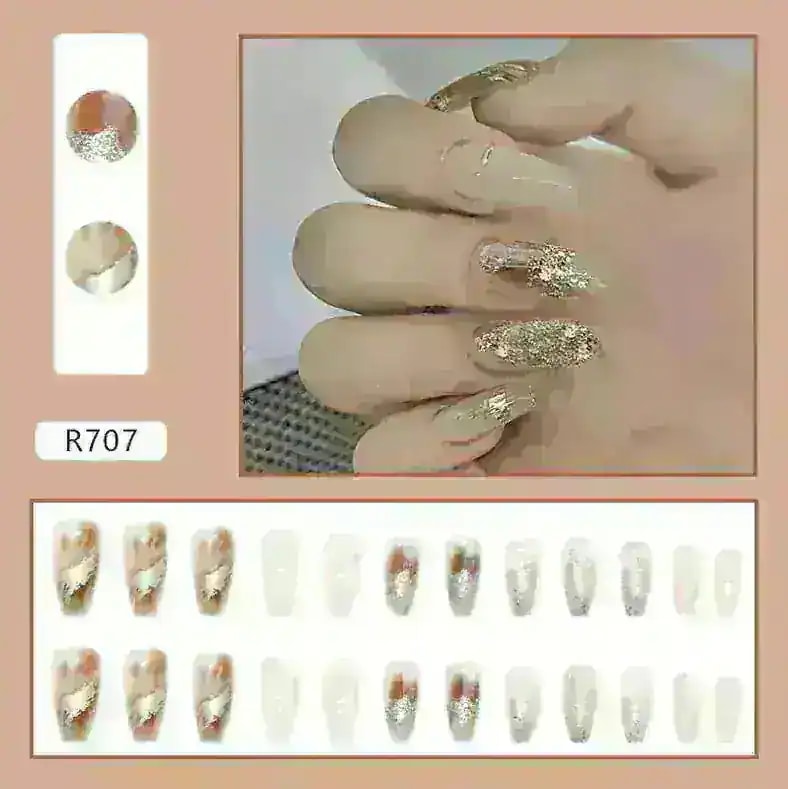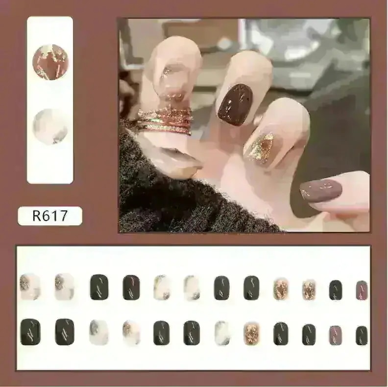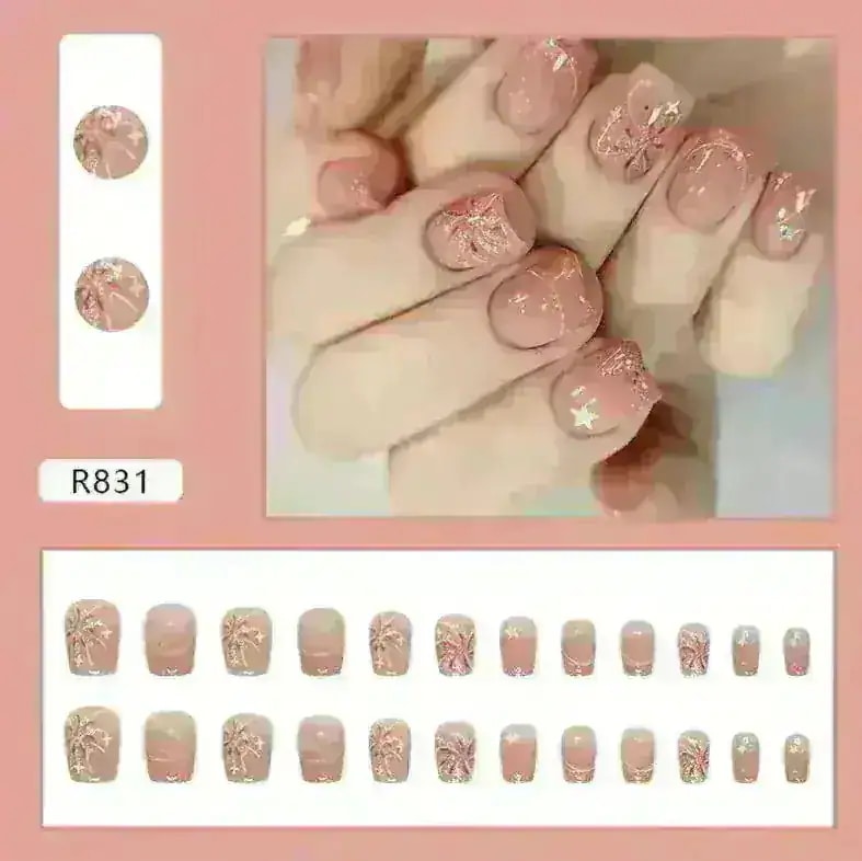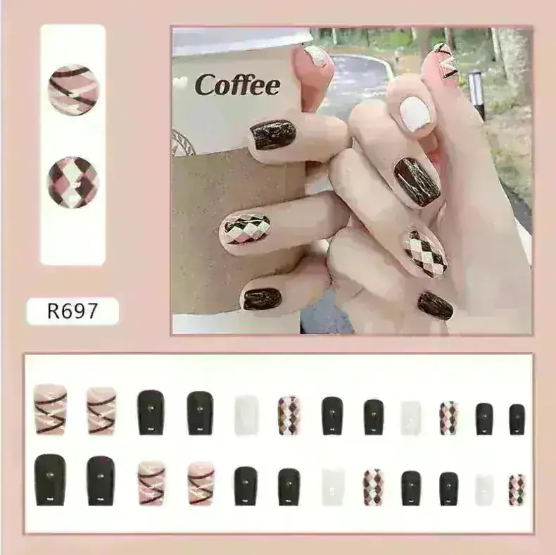 R774:サンプル写真を見ると、お花の部分が濃い茶色のように見えましたが黒色でした。また、思っていたよりもピンク見が強い商品です。ネイルの形はカーブが強く、縦に長めのネイルチップとなっています。
