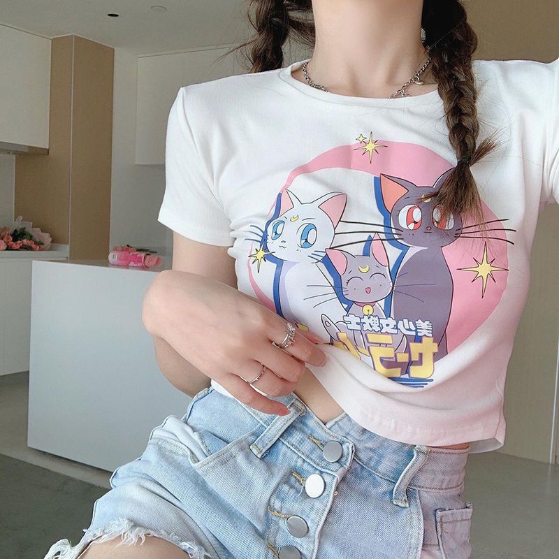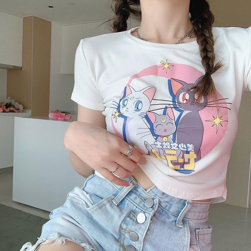 新品追加 ショートコットンセーラームーン半袖tシャツプリント女性可愛いスタイルスリムクロップトップ