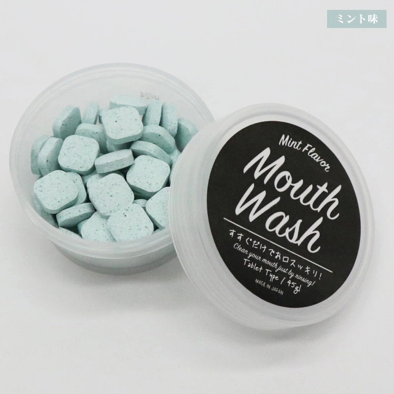 書いてありますが、1つ口に入れて噛みます。そのまま口をゆすぐとマウスウォッシュ、歯ブラシでこすると歯磨き。