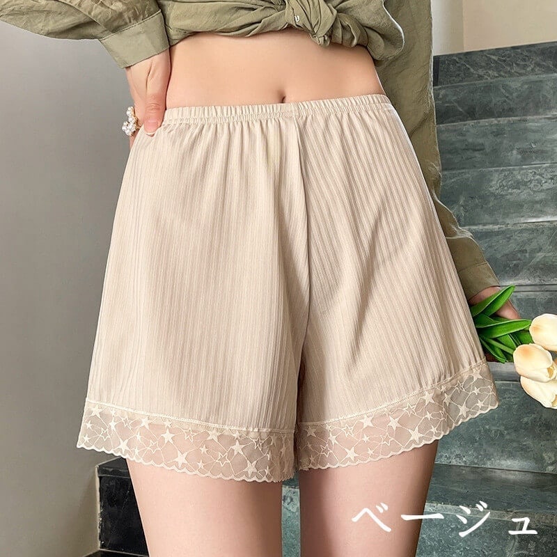 本体はストライプみたいで、すそは星の透かし模様がかわいい。頼んだ翌日届きました。割としっかりした素材です。試しに着てみたら、写真みたいにはならなかった。脚が太いのかモデルさんみたくゆるくなかった。でもツルツルした素材は着心地いいです。