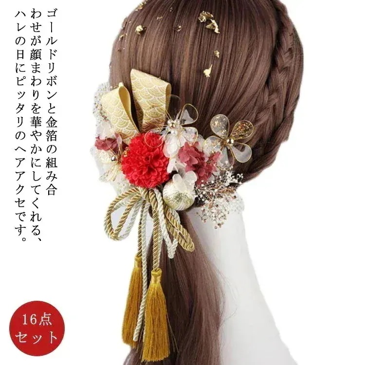 髪飾り 成人式 16点セット ドライフラワー ゴールド 金箔 水引 紐 造花 かすみ草 菊 リボン 和玉 かんざし 和装 お花 振袖 袴 ウェディング 結婚式 卒業式 成人式 前撮り 華や