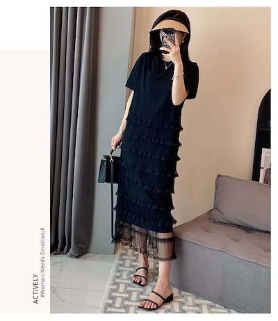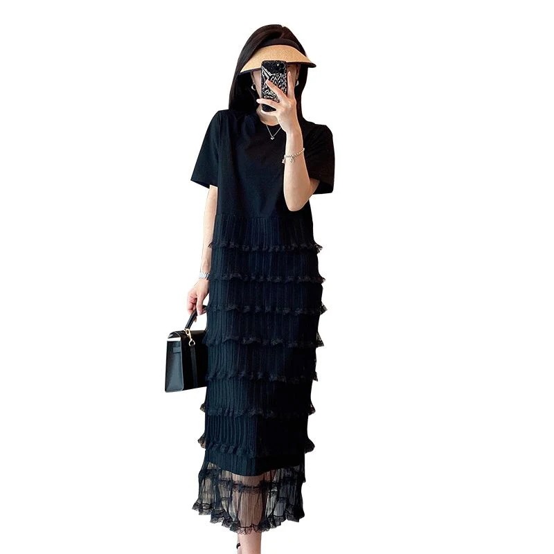 ワンピース 2024 夏 新作 黒のパッチワークTシャツワンピースケーキスカート 着痩せ 百掛け 韓国ファッション