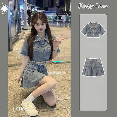 【2点セット】高級感 ショート デニムジャケット+プリーツスカート 上下セット レディース レトロ 半袖 セットアップ