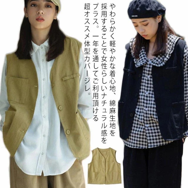 ジレベスト レディース 前開き おしゃれ 春夏 秋 ロング 薄手 無地 通勤 通学 リネン ノースリブ 羽織り かわいい ゆったり 大きいサイズ 黒 カーキ 20代 30代 40代 50代