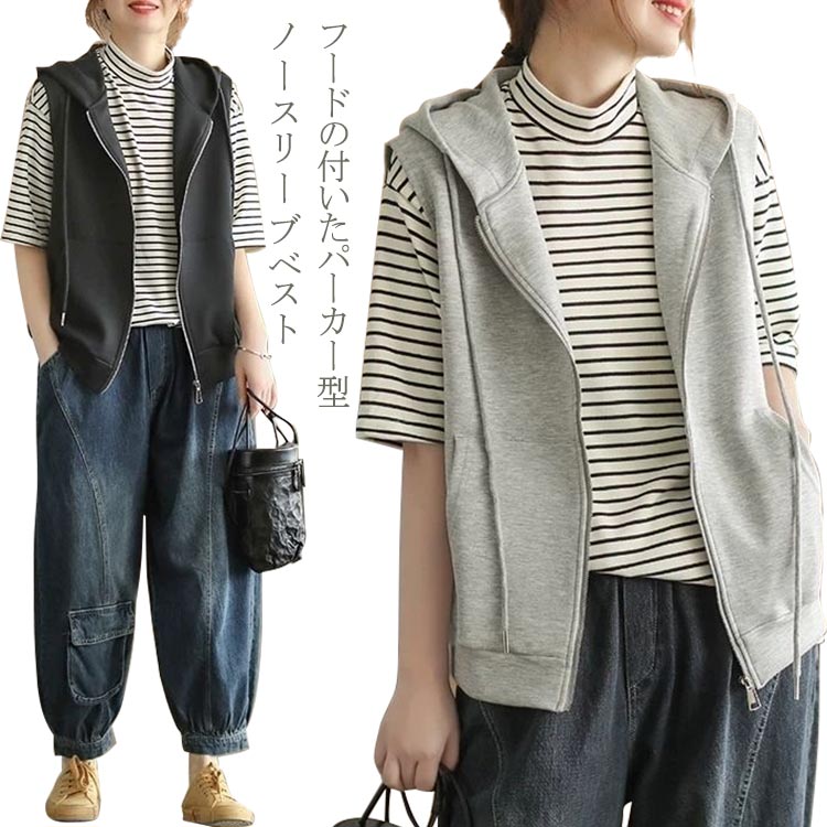 ベスト スウェット フード付き ゆったり 無地 ジップアップ 前開き レディース 羽織り ライトアウター 春アウター おしゃれ ノースリーブ 綿 ライトスエット ベスト 袖なし かわいい シンプル ト
