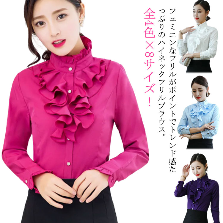 全48サイズ!スーツインナー シャツ ハイネック 立ち襟シャツ レディース フリルシャツ 2重フリル スタンドカラーシャツ フェミニン シフォンシャツ 無地 白 黒 パープル ピンク 大き