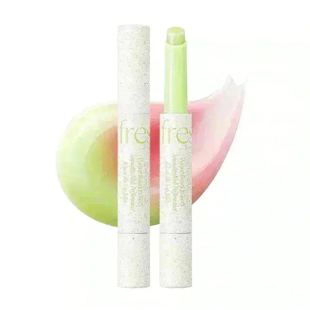 グリーンのリップを唇にのせるとローズピンクのような色味に反転して、程よいプランプ感が心地よく、とても艶やかで気に入りました♡上は一度塗り、下は二度塗りですが、一度塗るだけでも綺麗に発色します。ギフトには丸みを帯びた素敵なミラーとミニサイズのリップバームが付いてきました♬.*゚