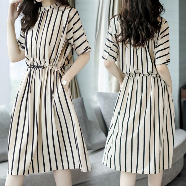 ワンピースレディーススウェットワンピースマキシワンピースミモレ丈ゆったり半袖ストライプ柄Aライン夏ロングワンピース通勤着痩せ