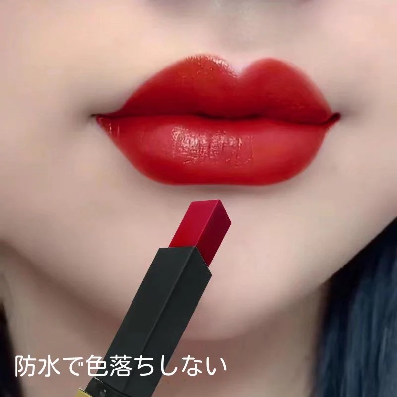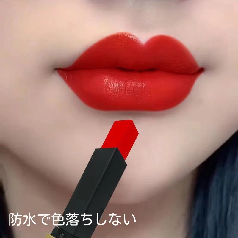 落ちないリップで検索、カラーは落ち着いた色目でした。色落ちは少ないですがマット感がなく、途中で 唇が乾燥してしまいました。形は菱形で塗りやすい気がします。
