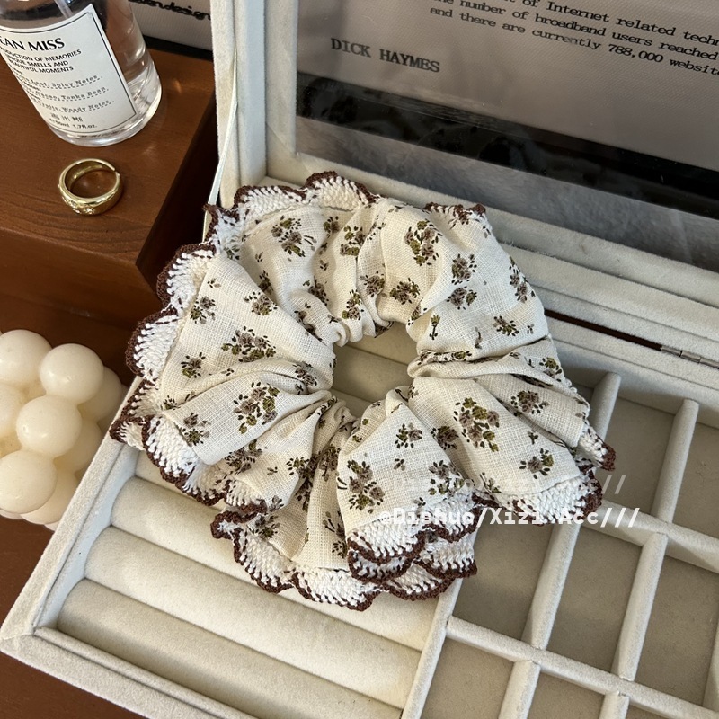 韓国風レトロブラウンの花柄レースの大腸シュシュシンプルで甘い森系お団子ヘアロープで髪飾り