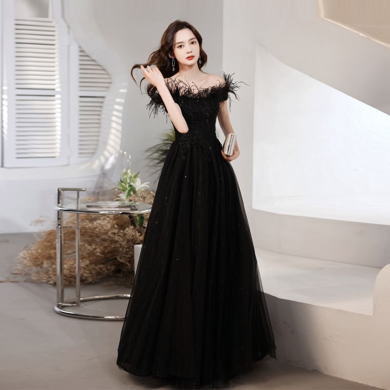 ブラックイブニングドレス2025イブニングドレスバンケット気質ドレスレディース