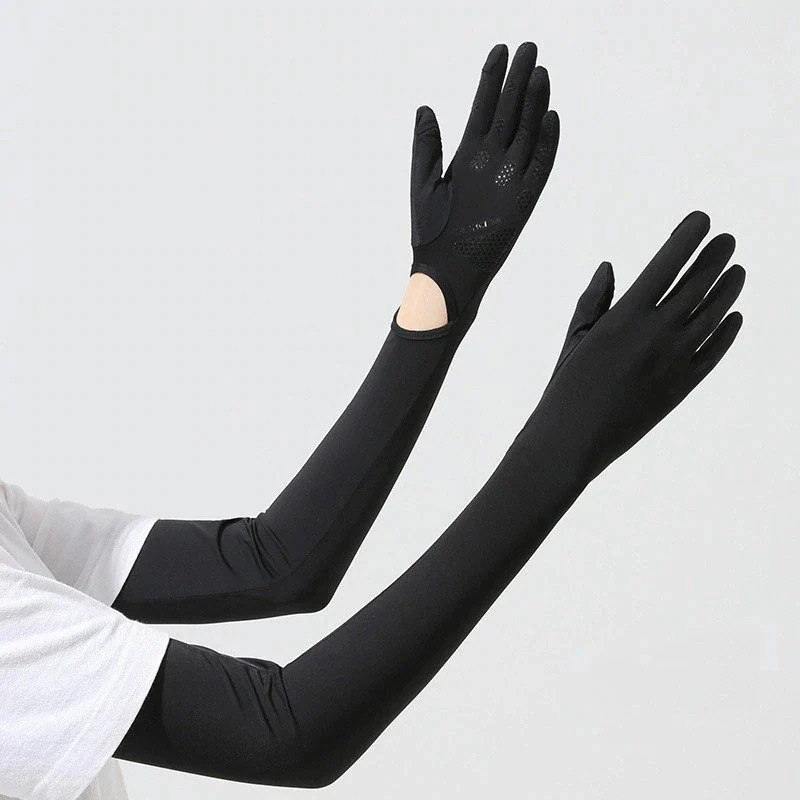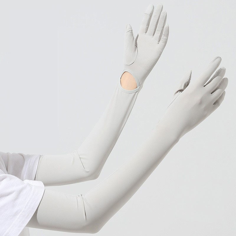 半袖着ていても二の腕まで隠せるくらいの長さ!涼しい素材で手首の切れ込み?から手袋部分を着脱できて夏の日焼け対策に便利!愛用してます