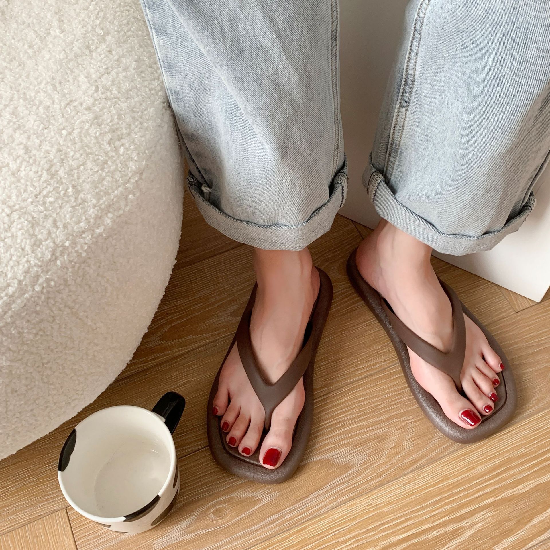 人の字のスリッパ女性シンプルな純色の外に柔らかい底の平底の冷たいスリッパを履く方頭の砂浜に足のスリッパを挟む