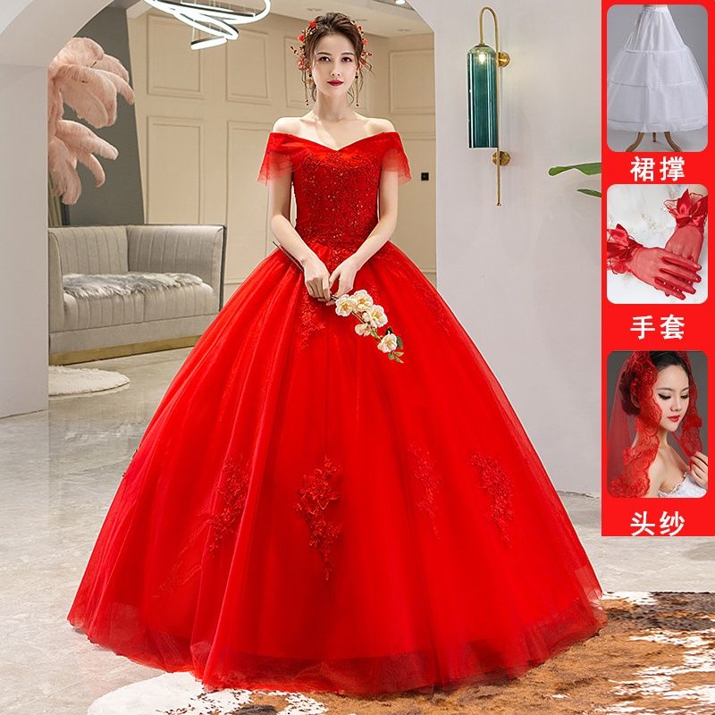 マタニティウェディングドレス2025春韓国版ワンショルダーレッドウェディングフロアレングスブライダルドレススリムハイウエスト ウェディングドレス