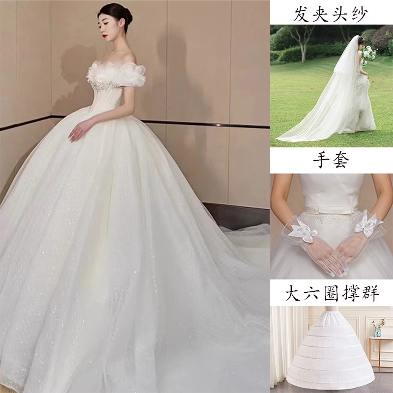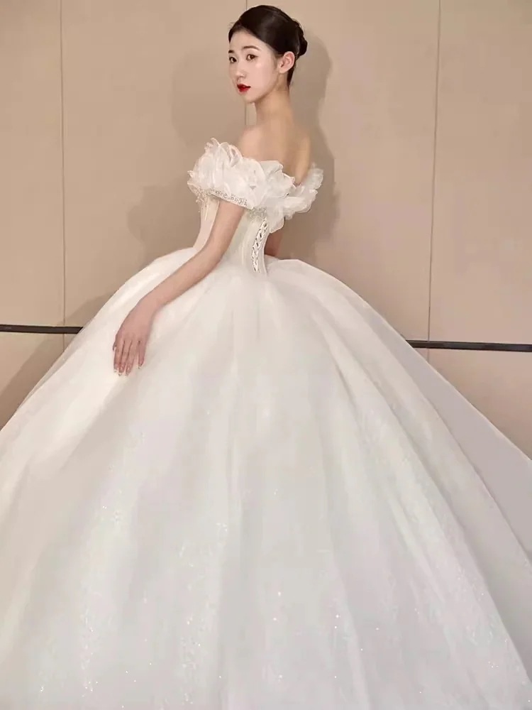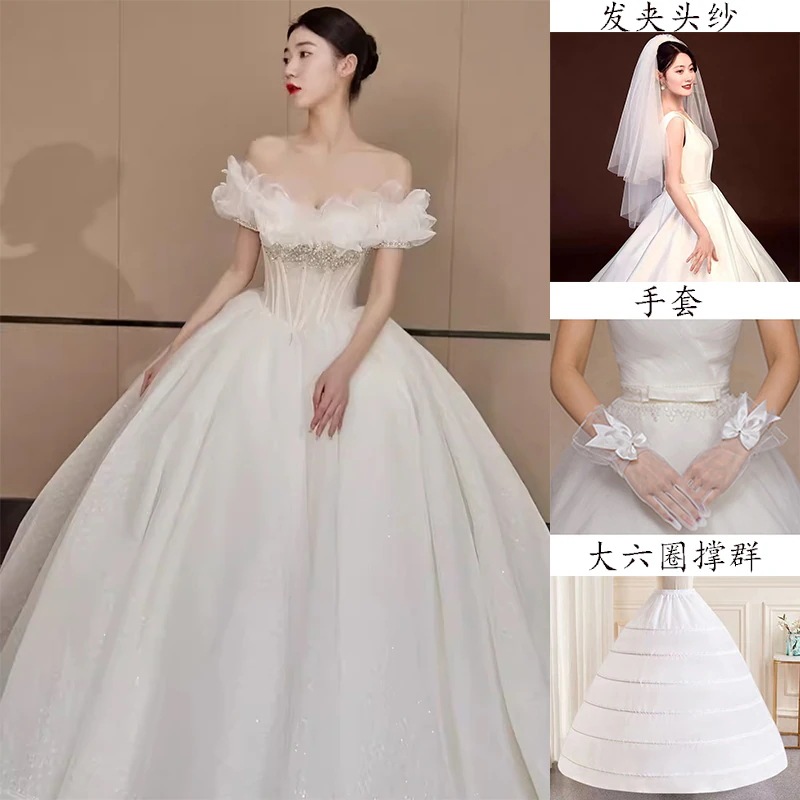 ワンショルダーウェディングドレス2025ブライダル主糸ラージテールハイグレード立体花びらを地面まで