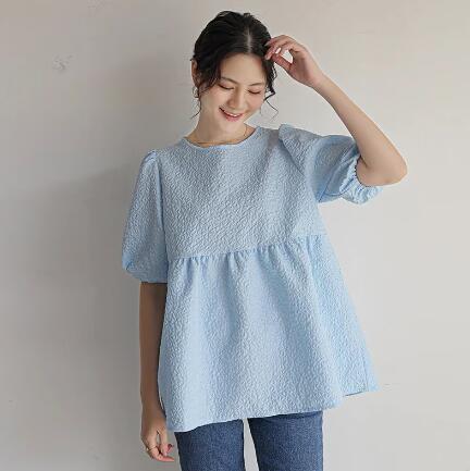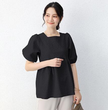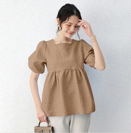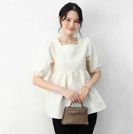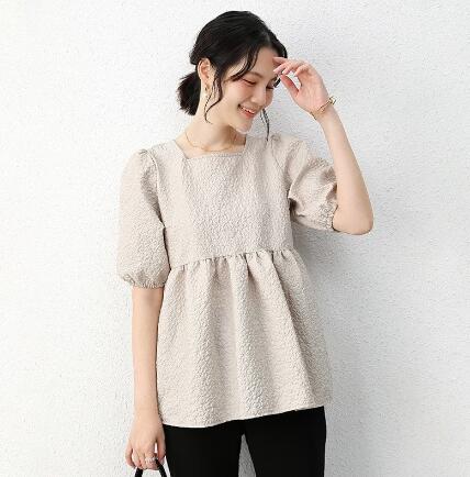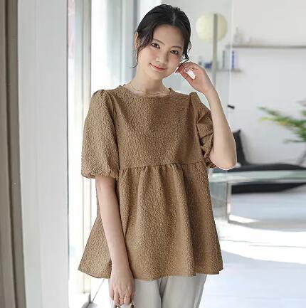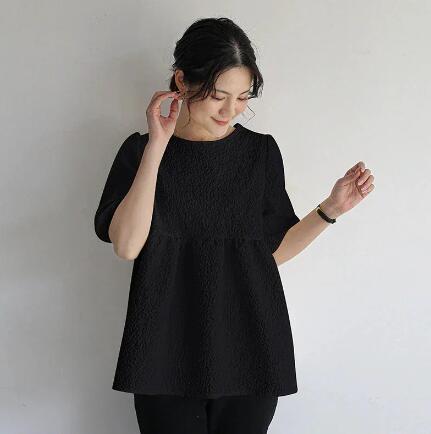新品ブラウス レディース ジャガード 半袖 五分袖 バルーン袖 パフ袖 エンボス 凸凹 膨れ リボン ペプラム お洒落 フレア スクエアネック プルオーバー 選べる2タイプ