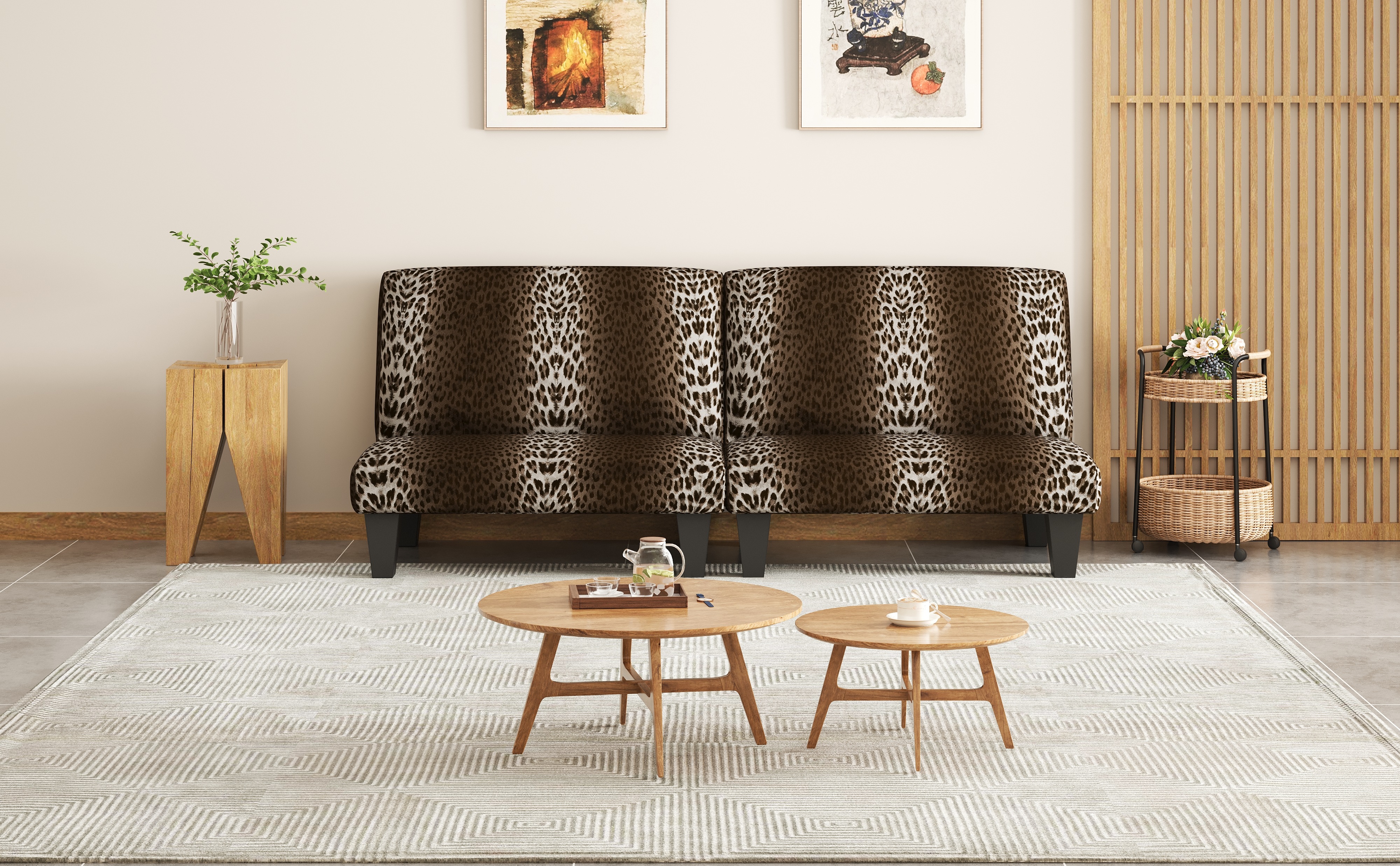 | 材料/素材 | 本体:天然木 脚部:塩化ビニル樹脂 張り材:ゼブラ柄ファブリック、 クッション材:ウレタンフォーム | ||