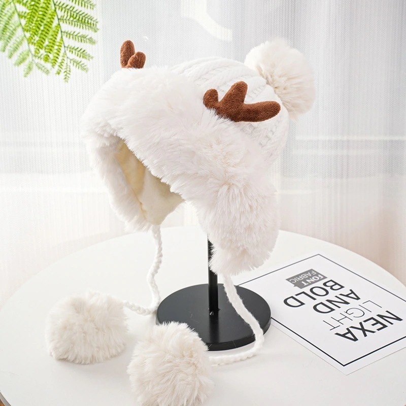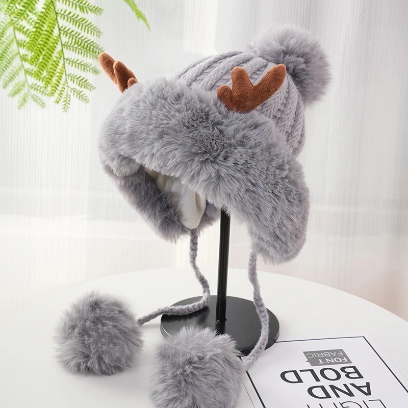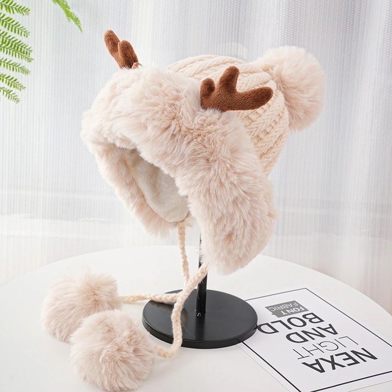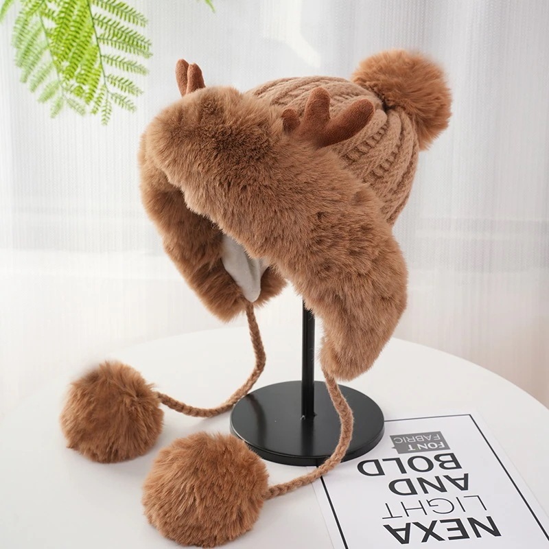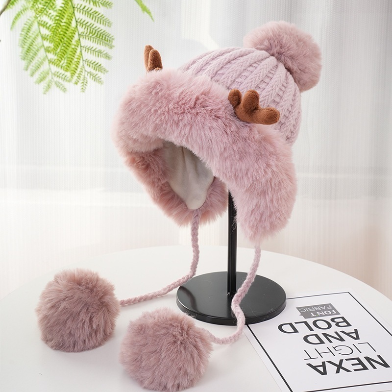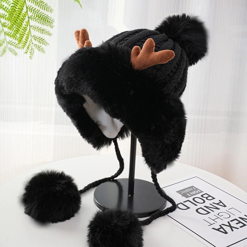 人気新作冬のかわいい鹿の角の毛玉の耳保護用のモコモコのサンタ帽に東北帽の自転車帽を厚くした帽子