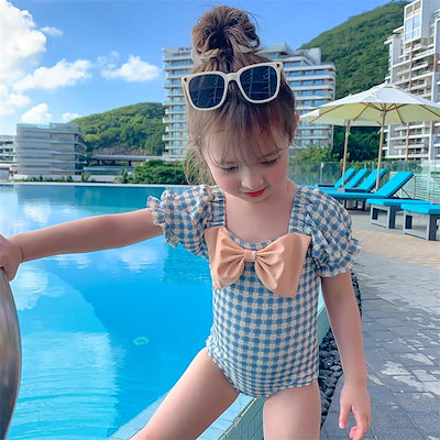 スクール ビーチウェア チェック柄 リボン ロンパース キッズ水着 ビキニ 女の子水着 オールインワン 子供水着 ガールズ 夏 モノキニ プール 水泳