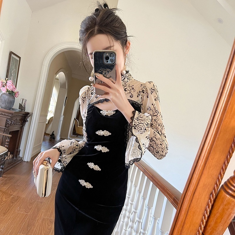 新しい中国風チャイナドレス 2024 冬中国風デザイン中空ベルベットヒップドレス 30716