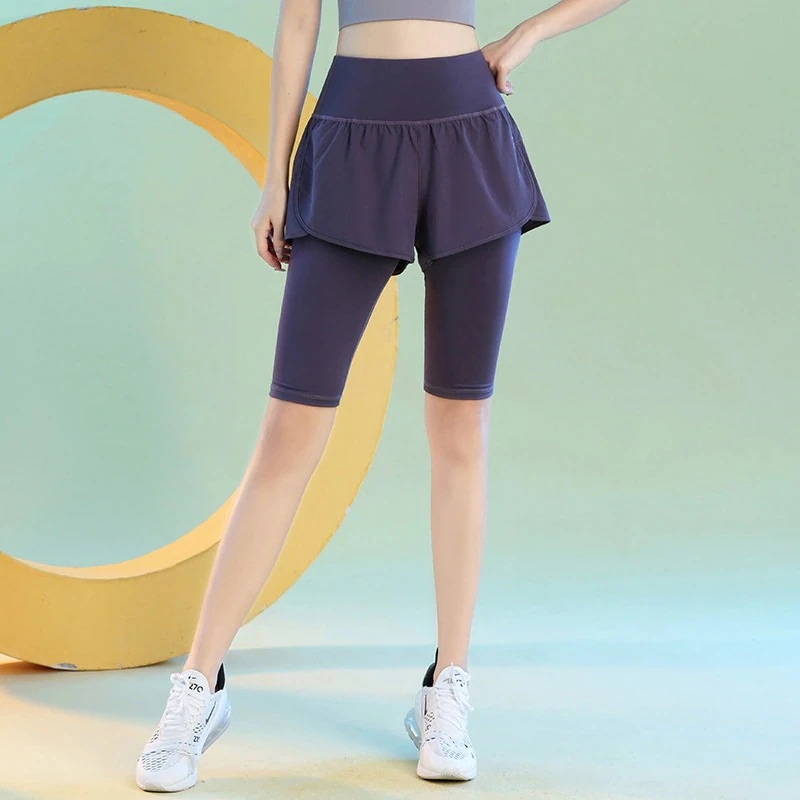 夏用 クイックドライ フェイク ツーピース アンチグレア ハイウエスト フィットネス カジュアル ビーチバレー スポコス パンツ 韓国ファッション