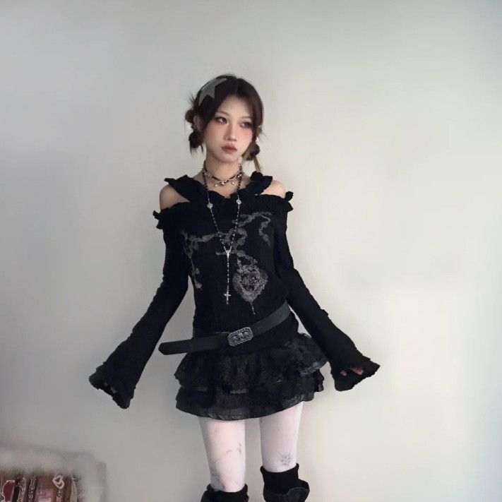 2026 ニュースタイル ダーク ゴシック パンク ゴシック プリント リバーシブル ワンショルダー フレアスリーブ ニット トップス