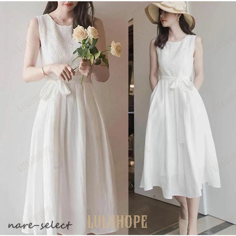 真っ白ワンピース レースワンピ マキンワンピース ノースリーブ シフォンワンピース 腰のリボンが長い 女性 夏 ドレス パーティードレス フォーマル