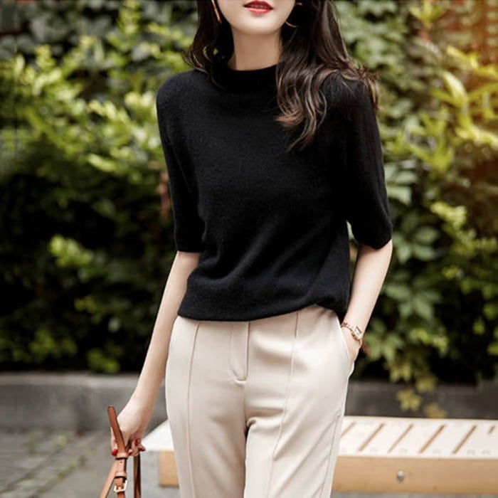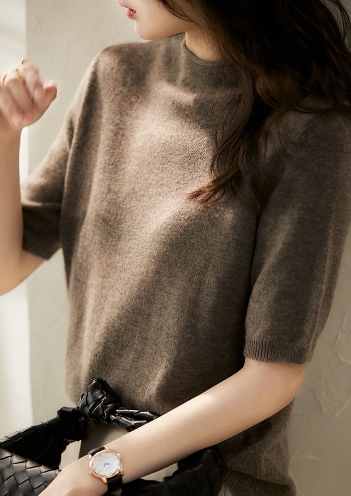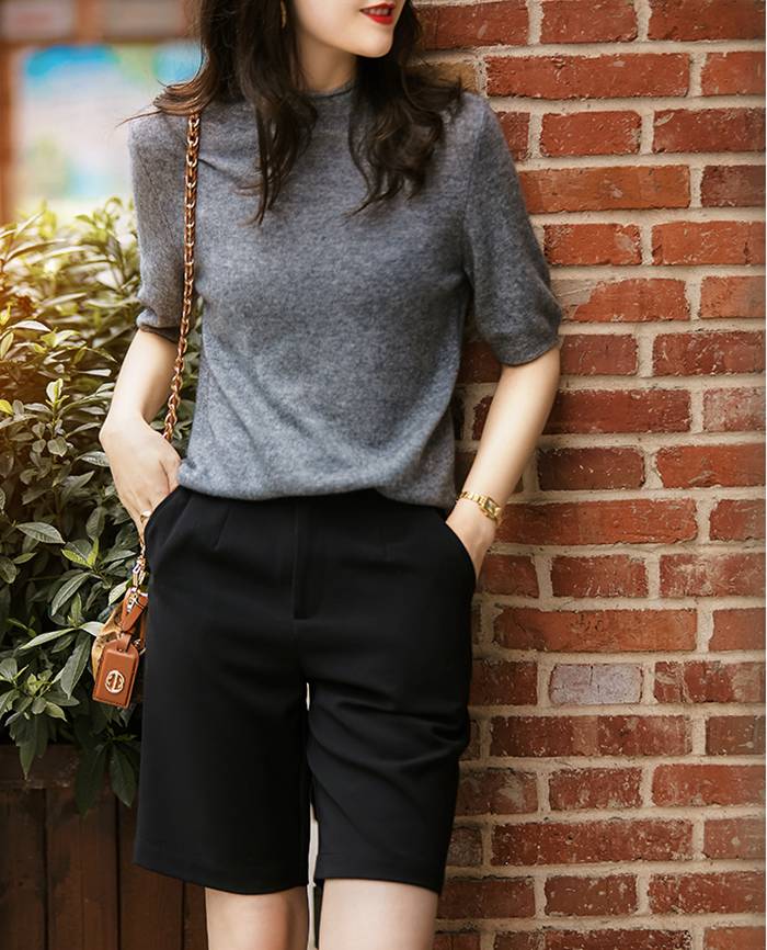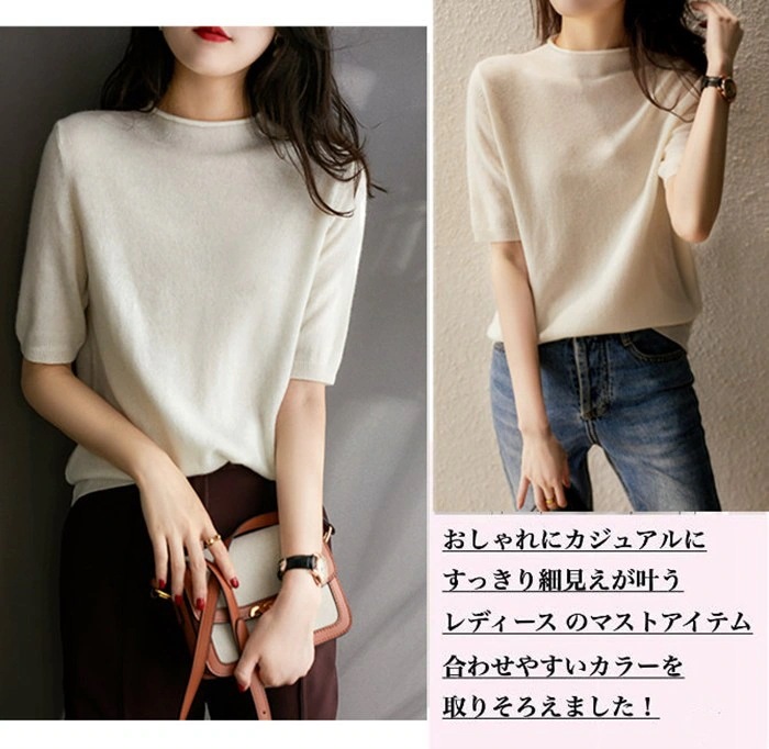 ニット 二の腕カバー 五分袖 半袖 サマーニット プチハイネック トップス 半袖ニット シンプル 涼しい