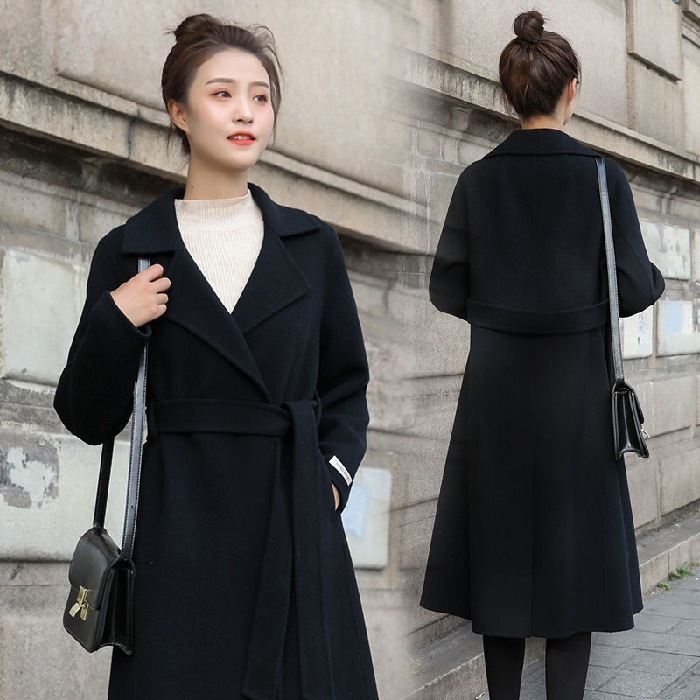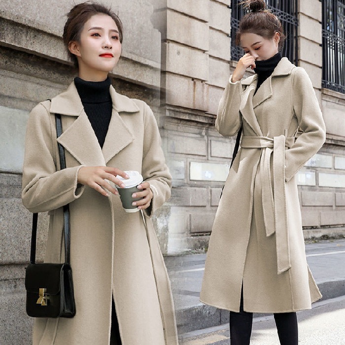 韓国風秋冬ったりスタイル大きいサイズミドル丈膝上レースアップウールコート女性用スリムウールコート