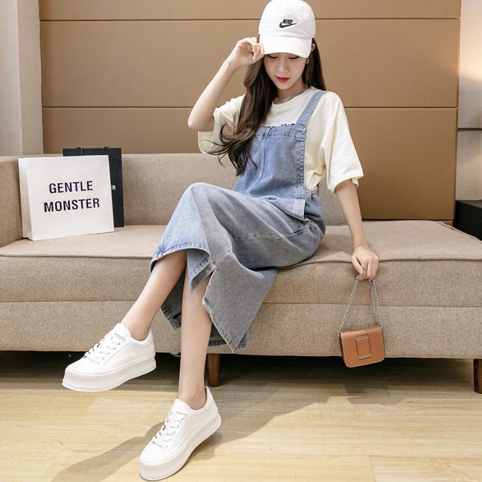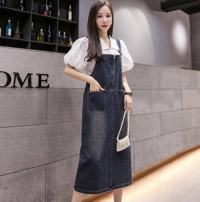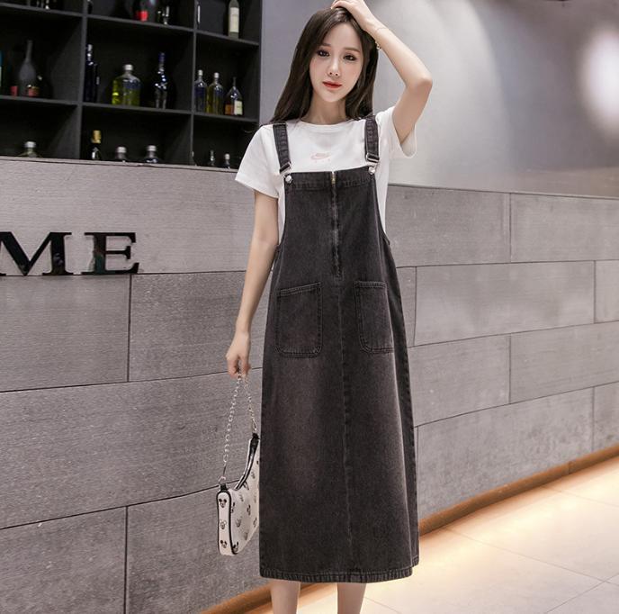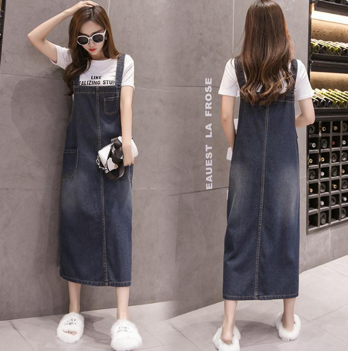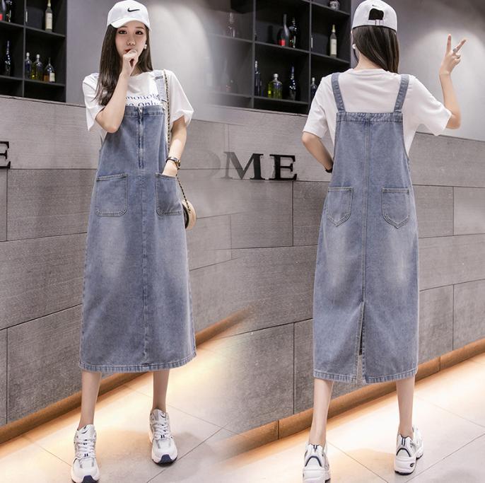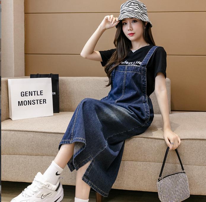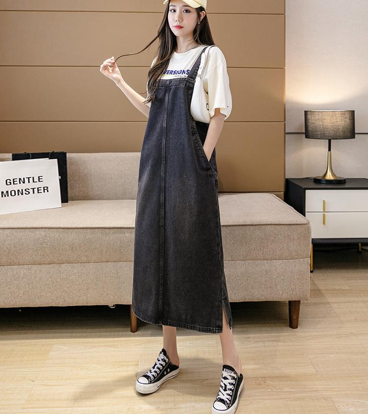 サロペット カジュアルデニムストラップワンピース ミドル丈 薄手ドレス