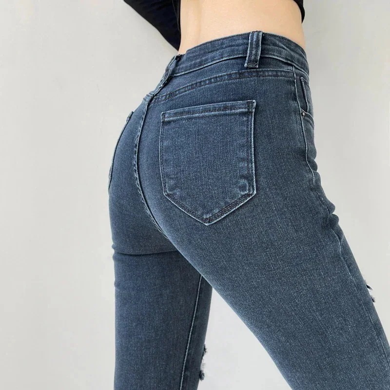 脚長効果!ハイウエストパンツ 2024秋新作ストレッチ穴あきスキニージーンズブルーグレースキニーパンツ