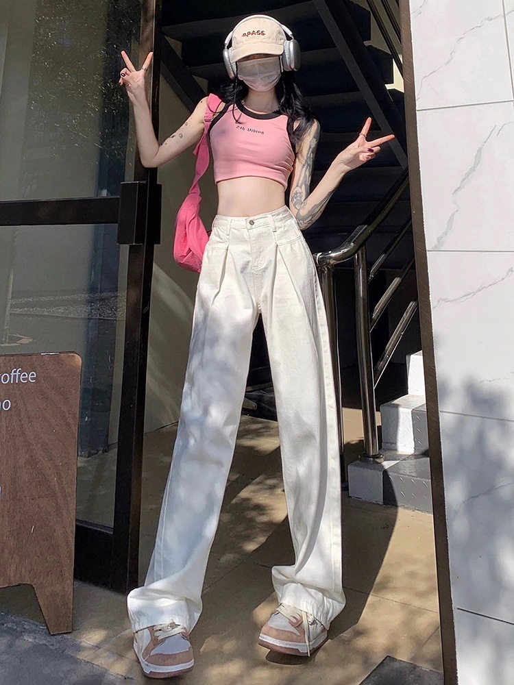 デニムボトムス ジーンズ ワイドパンツ レディース ホワイト レトロ 着痩せ ジーンズ ロングパンツ レディース服 デザイン感 ハイウェストゆったり 長ズボン ロングズボン ワイドパンツ モップパンツ