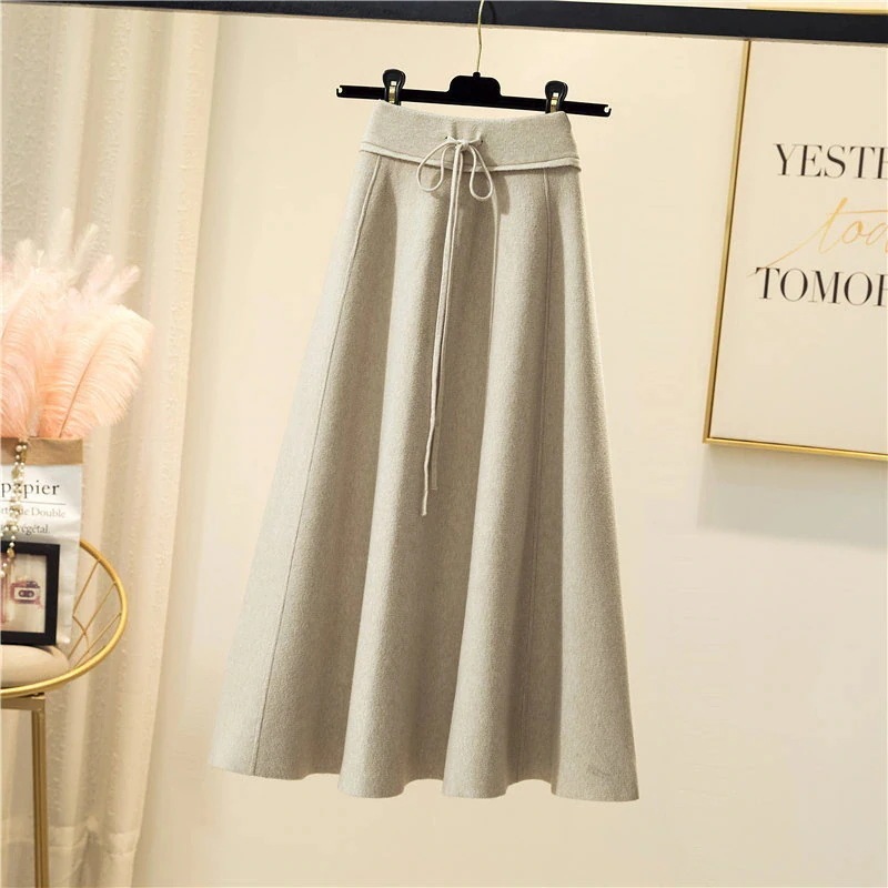 Qoo10限定 プリーツスカート 韓国 ニット半身スカート秋冬新作ハイウエスト百合着やせ見えミディアム a字スカート ロングスカート レディースプリーツスカート