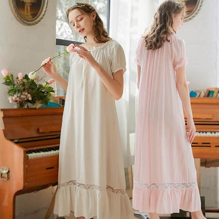 ネグリジェ レディース 春 夏 ロング ネグリジェ 姫 半袖 長袖 綿 無地 ガウン ナイトウェア