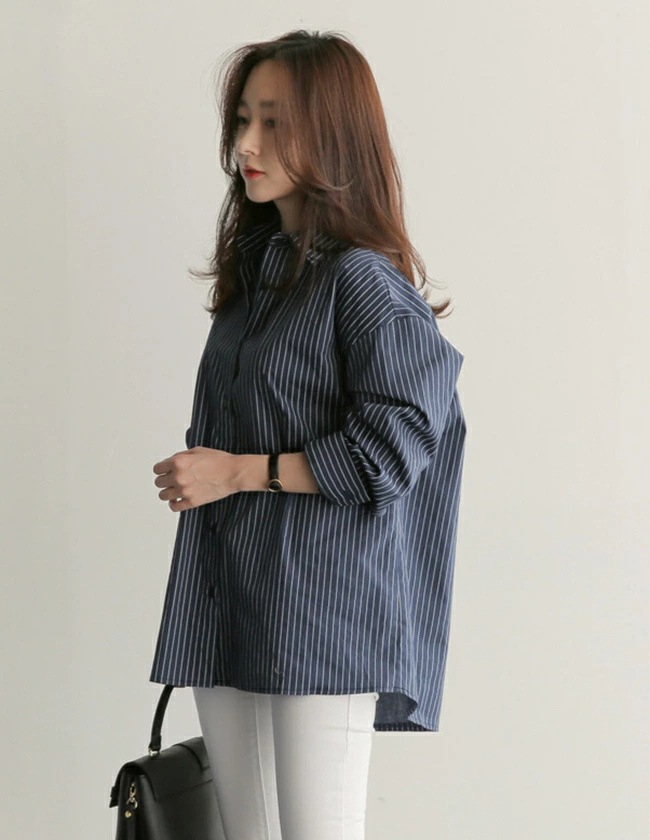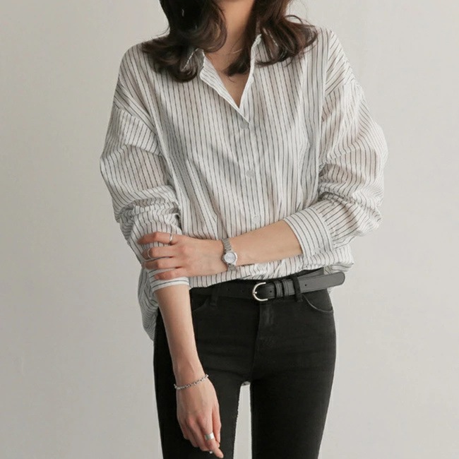 ブラウス シャツ レディース トップス 長袖 ストライプ ロング ドロップショルダー ゆったり 大きいサイズ 襟付き 春秋 羽織もの