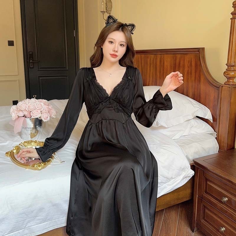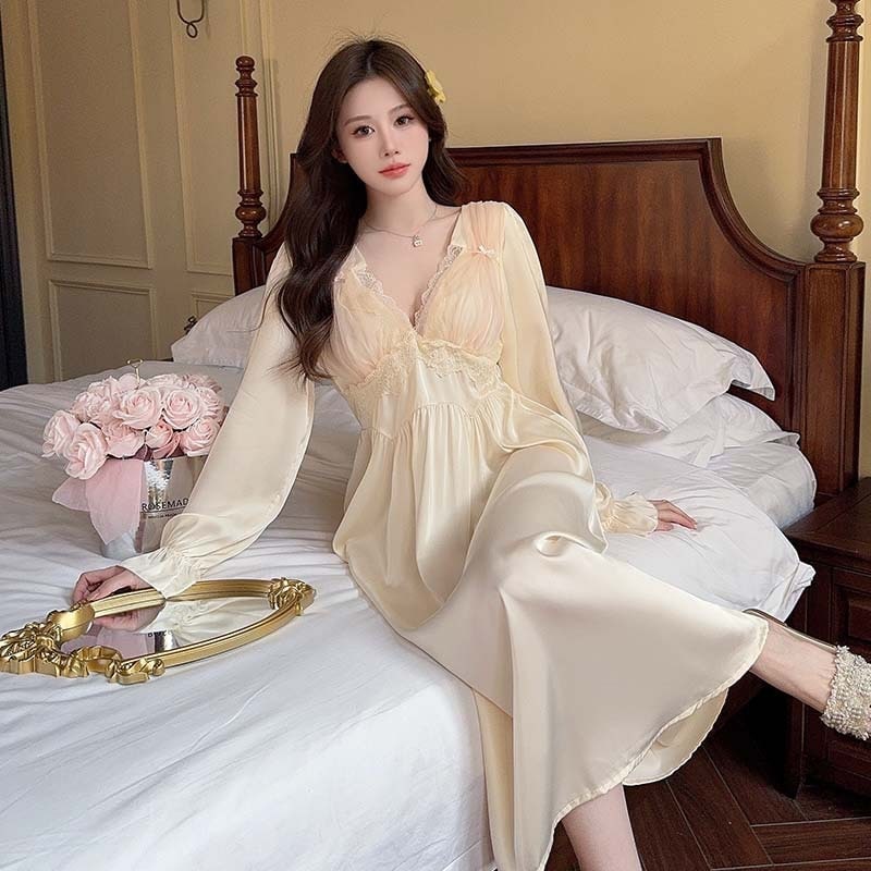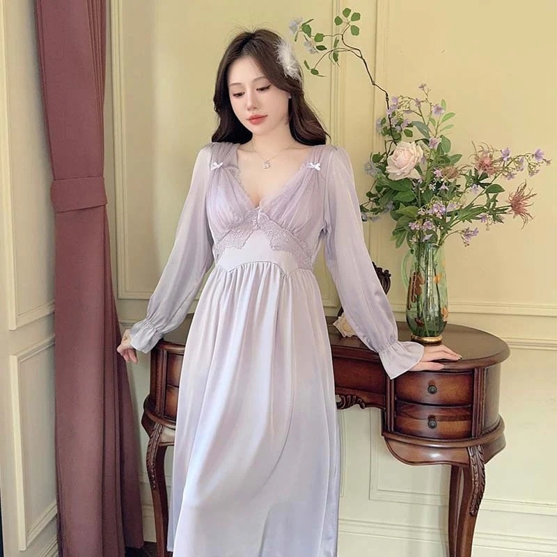 春夏 パジャマ ワンピース レディース 長袖 シフォン レース Vネック 寝巻き 胸パッド付き セクシー ロングワンピース 寝間着 部屋着 ルームウェア