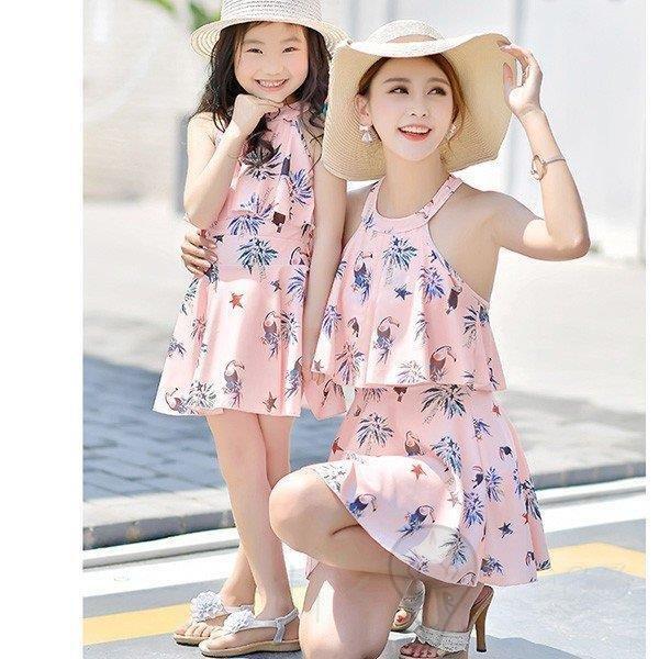 【夏のヒット】親子 お揃い 水着 セパレート ショーパン 2点セット レディース ティアード 水着 キッズ かわいい とり柄 椰子の木柄 女の子 子供用 swimsuit ペアルック 水着
